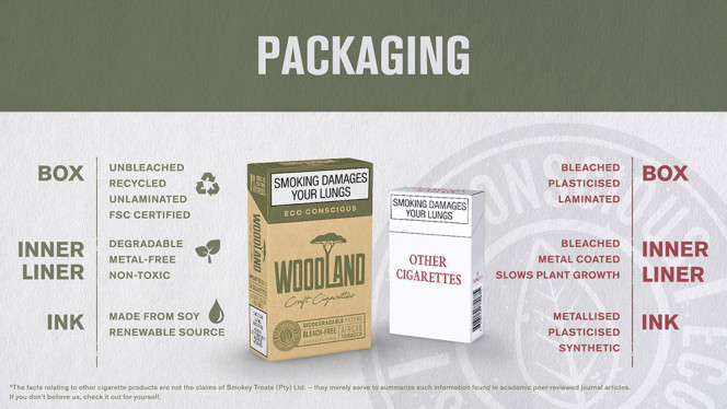 Smokey Treats-ի ստեղծած ծխախոտը ստացել է Woodland Craft անվանումը, դրա մեկ տուփում կա 20 գլանակ: Ծխախոտի ֆիլտրի, ինչպես նաև դրա տուփի բաղադրության մեջ կա 100%-ով կենսաբանական քայքայման ենթակա փայտասոսինձ: Մինչդեռ սովորական ծխախոտի մնացորդներում կա մեծ քանակությամբ պլաստիկ, որը գրեթե չի քայքայվում ու կուտակվելով աղբի մեծ կույտեր է առաջացնում: Նշվում Է, որ աշխարհում յուրաքանչյուր րոպեի ընթացքում հավաքվում է մոտ 2 մլն ծխախոտի մնացորդ: