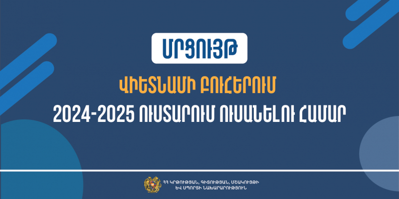 ՀՀ կրթության, գիտության, մշակույթի և սպորտի նախարարությունը 2024-2025 ուսումնական տարվա համար հայտարարում է մրցույթ` Վիետնամի Սոցիալիստական Հանրապետության բարձրագույն ուսումնական հաստատություններում բակալավրի, մագիստրոսի, ասպիրանտուրայի կրթական ծրագրերով ուսանելու, ինչպես ...