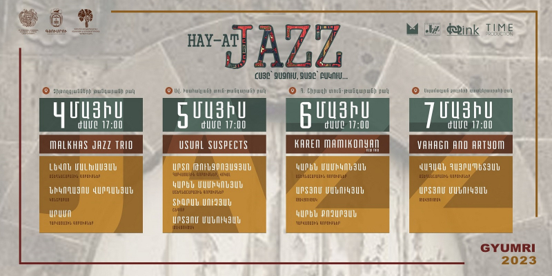 Գյումրիում 5-րդ անգամ կանցկացվի HAY-AT JAZZ ամենամյա ջազային փառատոնը։ Փառատոնն այս տարի կրում է «Հայը՝ ջազում, ջազը՝ բակում…» խորագիրը. այն կանցկացվի մայիսի 4-7-ը: Ջազային համերգների հարթակներն են Գյումրու թանգարանների բակերը։ Նախագծի հեղինակը «Մանուկյան» ընկերությունն է, ...
